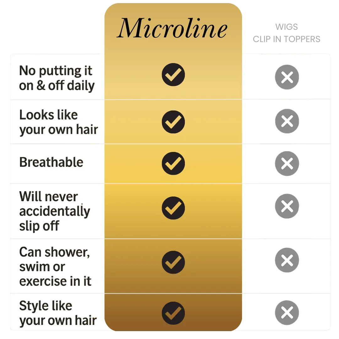 Unlike wigs, MicroLines stay on 24/7 and become part of your everyday hair routine. They don’t shift, they let your scalp breathe, and you can style, swim, or sleep in them. No compromises.